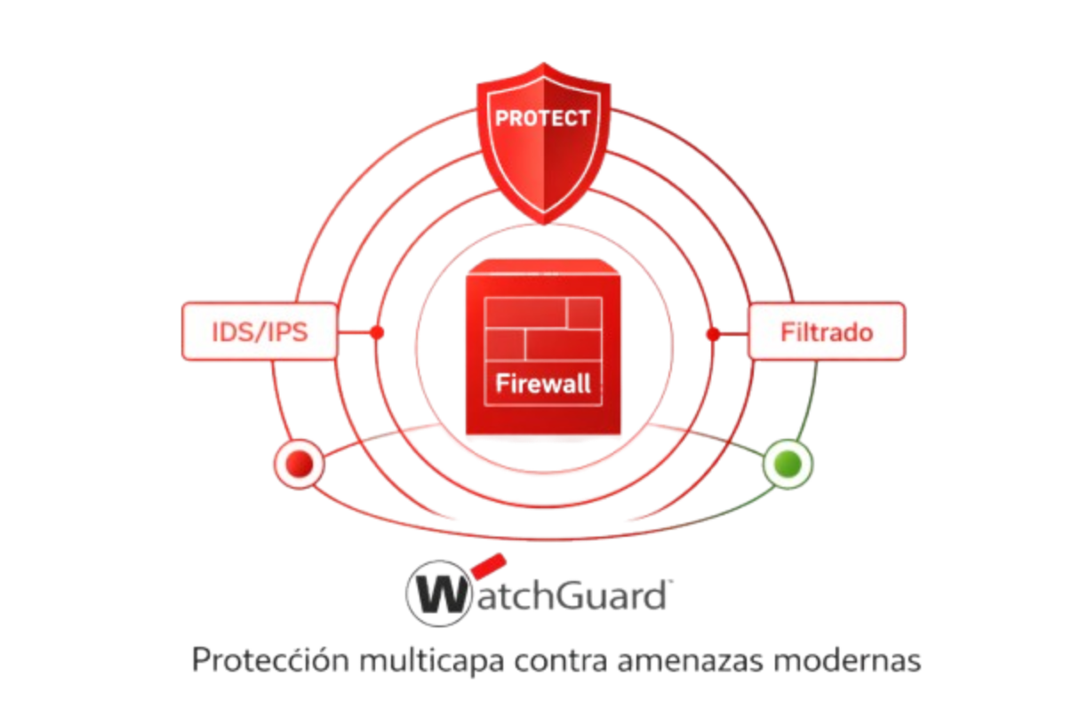 El WatchGuard Firebox M395 ofrece una protección integral frente a amenazas actuales gracias a sus múltiples capas de seguridad. Incorpora tecnologías como inspección profunda de paquetes, prevención de intrusiones (IPS) y filtrado de contenido, lo que permite detectar y bloquear ataques a su red.